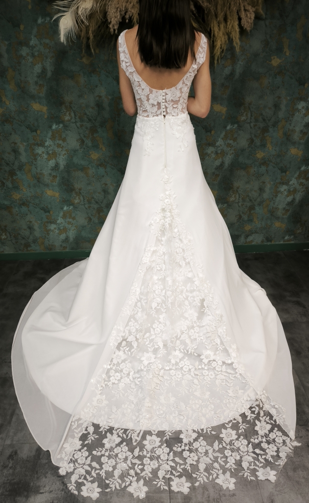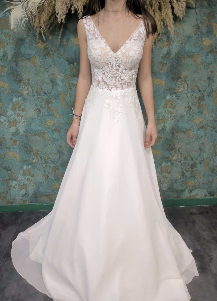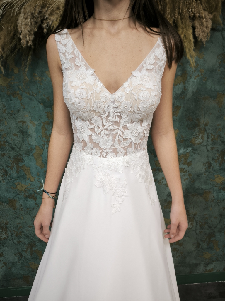 Disponible à l'essayage uniquement dans notre boutique de Besançon. Uniquement en ivoire. Avec ou sans dentelle dans la traîne. Modifications possibles sur devis. Code prix: ☆☆☆