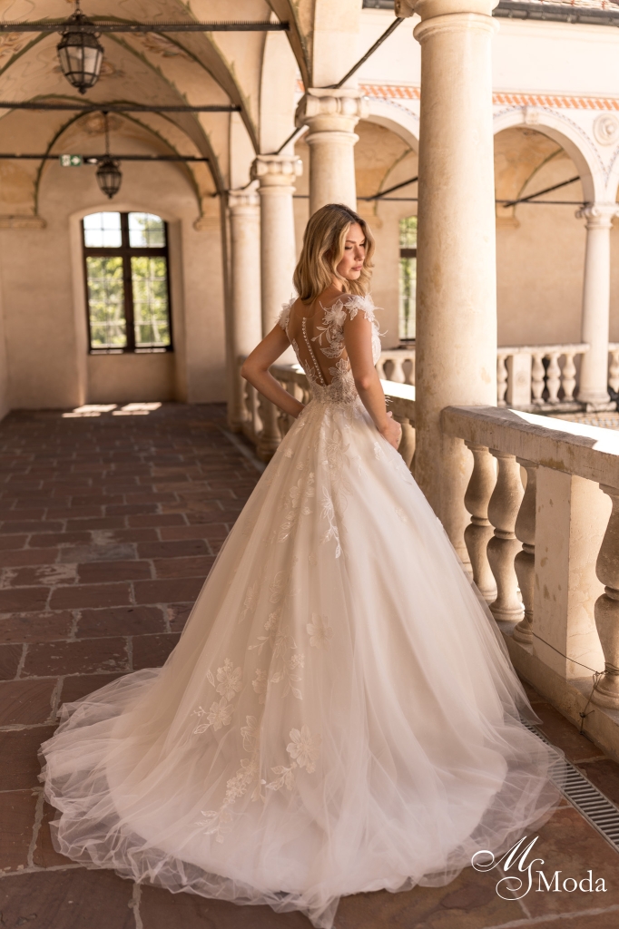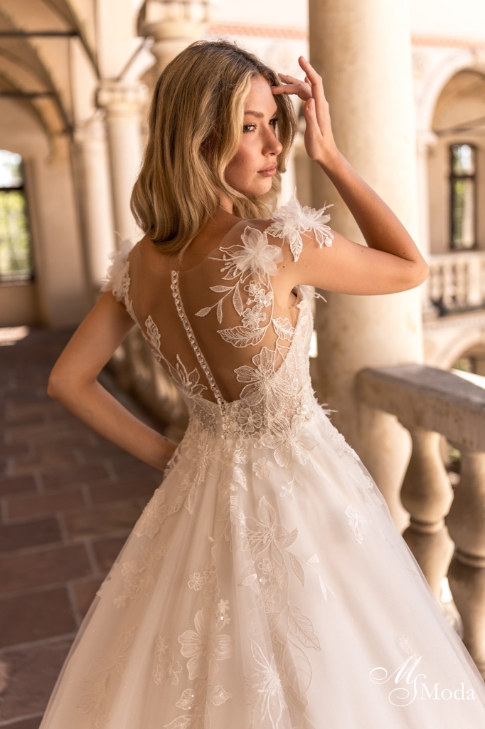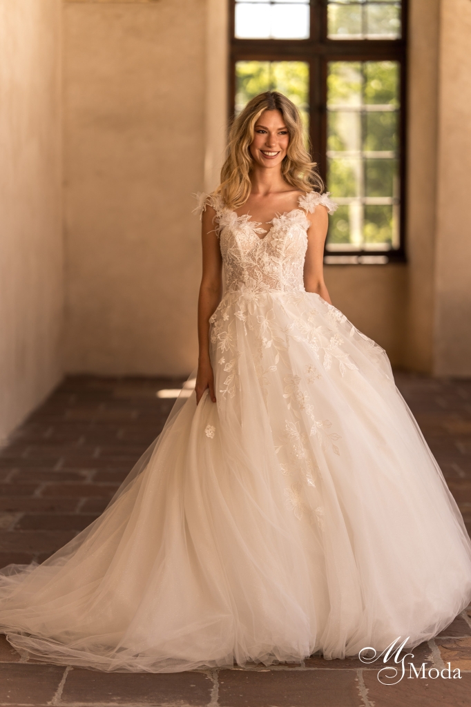 Bientôt disponible à l'essayage uniquement dans notre boutique de Besançon. En ivoire uniquement. Version sans les fleurs 3D sur l'encolure en magasin. Modifications possibles sur devis. Code prix: ☆☆☆☆☆
